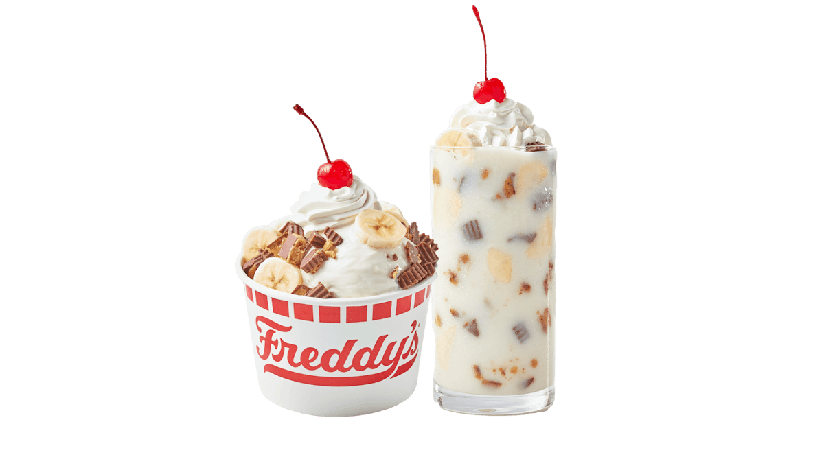 Peanut Butter Bananza Fresh & creamy vanilla custard, Reese's? Peanut Butter Cup, banana, whipped cream & a cherry.