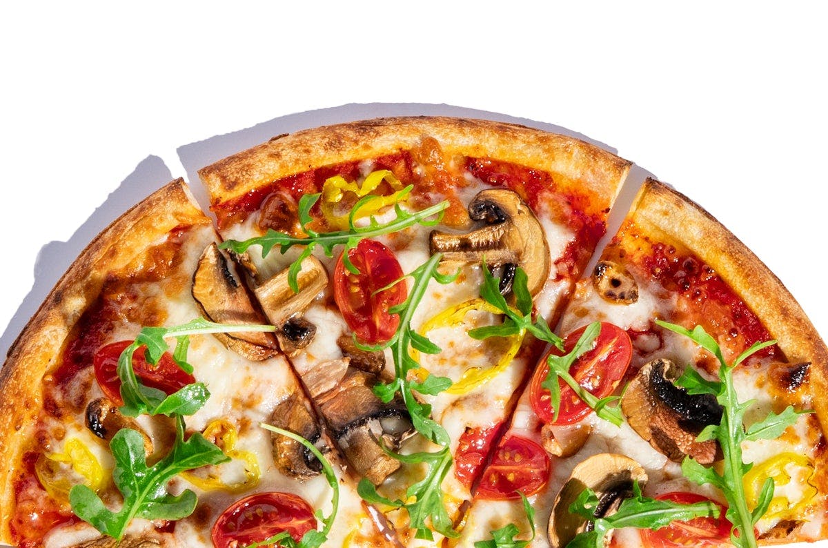 Herbivore Half 11-inch Pizza + choice of side A new and crazy delicious way to get your daily dose of veggies. Our garden-inspired creation starts off with our spicy red sauce topped with generous portions of shredded mozzarella, mushrooms, roasted garlic, tomatoes, banana peppers plus a finish of fresh arugula and a swirl of olive oil. Limited substitutions. Half 11-inch Pizza + choice of side