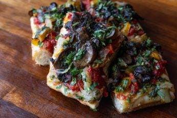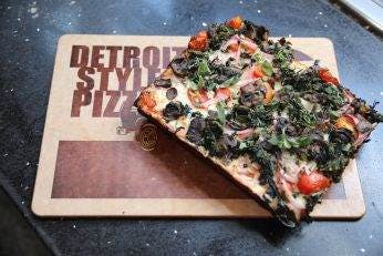 Detroit Vegan. Fresh tomato sauce, medley of roasted peppers, cremini mushrooms, sweet onions, basil pesto, chopped parsley, Detroit crust