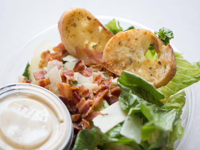 Caesar Salad (Side) Kale,crispy romaine hearts,homemade apple-wood bacon bits,shaved Parmesan,Caesar vinaigrette and garlic crostini.