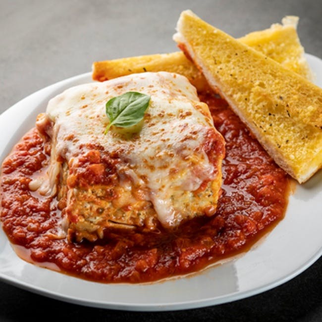 Baked Lasagna Homemade from the family recipe. Layers of pasta & three cheeses smothered in marinara sauce & mozzarella.