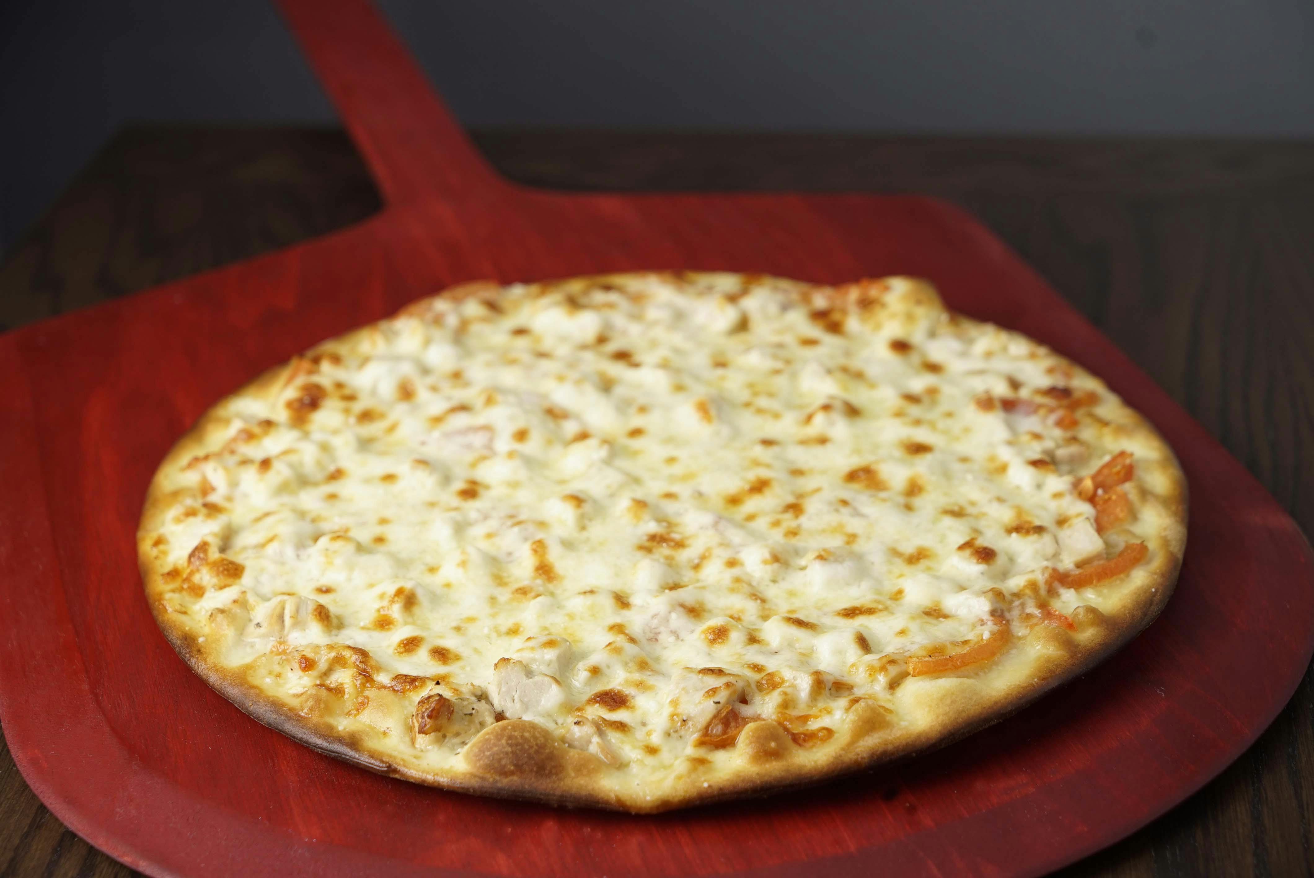 Chicken Delight Olive oil in place of pizza sauce with chicken breast chucks, garlic and tomato. Your choice of size is available.