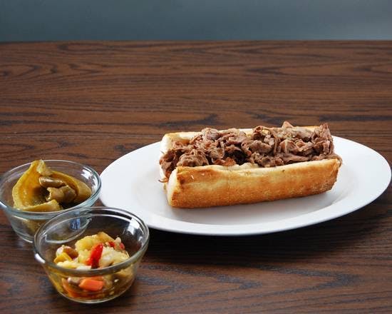 Italian Beef Sandwich Italian beef with au jus on French bread.