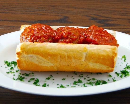 Meatball Sandwich Three meatballs with marinara sauce on French bread.