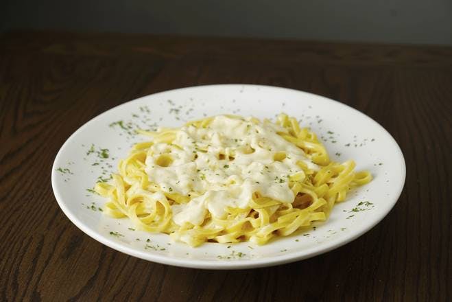 Fettuccine Alfredo Flat noodles and cream sauce. Served with garlic bread and grated cheese.