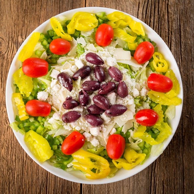 Greek Salad (580 cal) Romaine & iceberg lettuce, spinach leaves, feta cheese, green peppers, Greek olives, banana peppers, cucumbers, grape tomatoes & shaved Asiago cheese