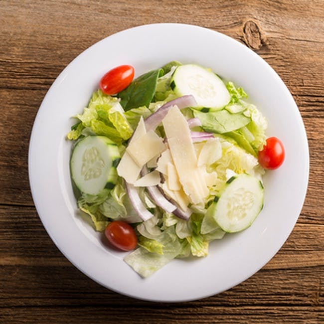 Garden Salad Romaine and Iceberg lettuce, spinach leaves, cucumbers, grape tomatoes, red onion and shaved Asiago cheese