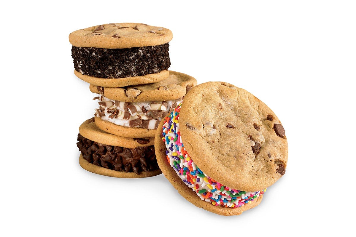 - Ice Cream Cookie Sandwich Variety 4-Pack - Ready NowOne of each of our Cake Batter? Sprinkle, Cookie Crumb Yum, Kiss N' Tell Chocolate, and Perfect Duet Ice Cream Cookie Sandwiches Cake Batter? Sprinkle: Cake Batter Ice Cream? sandwiched by moist Chocolate Chip Cookies and rolled in Rainbow Sprinkles Cookie Crumb Yum: Sweet Cream Ice Cream sandwiched by moist Chocolate Chip Cookies and rolled in OREO? Cookie Kiss N' Tell Chocolate: Chocolate Ice Cream sandwiched by moist Chocolate Chip Cookies and rolled in Chocolate Chips Perfect Duet: Sweet Cream Ice Cream sandwiched by moist Chocolate Chip Cookies and rolled in White & Milk Chocolate **This item is ready for you to pick up which means we cannot make any changes or substitutions.$17.54