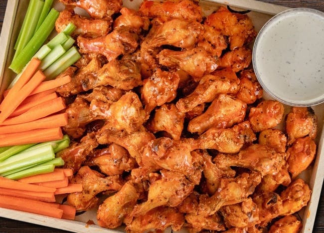 - 6 TRADITIONAL BONE IN WINGSJuicy traditional bone-in wings, cooked to perfection, offering a delightful balance of crispy skin and tender meat Hot, Mild, Medium, Garlic Parmesan, BBQ, Sweet Chili, Sweet Chili Garlic Buffalo Garlic, and Nuclear ? Dipping sauce: ranch, blue cheese, and chipotle ranch$13.75