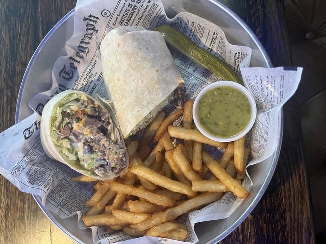 - PULLED PORK BURRITOPulled Pork, lettuce, pico de gallo, cheese, rice, beans, and sour cream wrapped in a flour tortilla. Served with fries$22.50