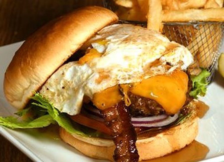- BREAKFAST ALL-DAY STEAK BURGERA juicy steak burger topped with crispy smoked bacon, creamy American cheese, a drizzle of rich maple syrup, and a perfectly fried egg, all served on a soft brioche bun.$22.50