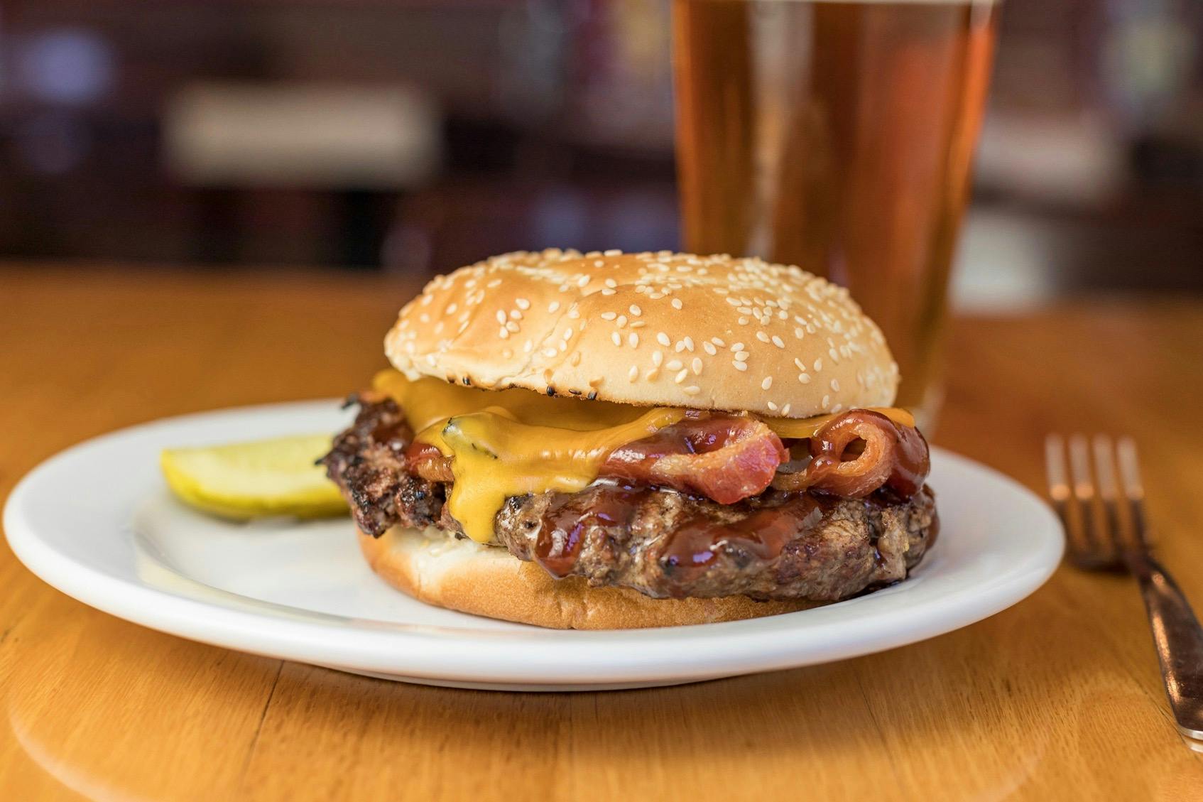 All Burgers Are A Half Pound if Certified Angus Beef, Char Grilled Over an Open Flame, Served on a Fresh Kaiser Bun with a Kosher Pickle. Add a Side of Pub Fries or House Fried Chips for $2 or a Side of Onion Rings for $2.75.