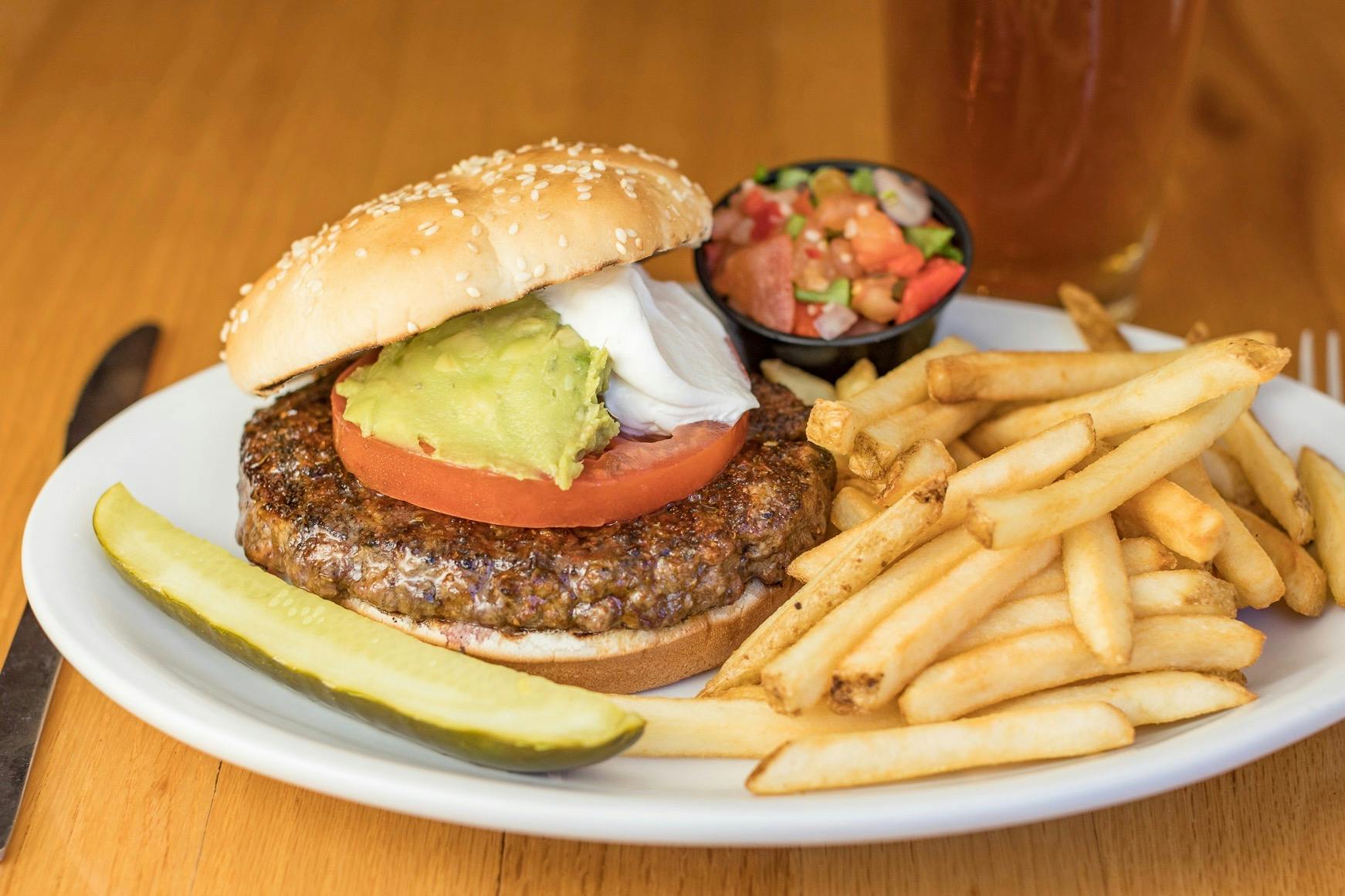 A Garden Veggie Patty Char Grilled Over an Open Flame, Served on a Fresh Kaiser Bun with a Kosher Pickle. Add a Side of Pub Fries or House Fried Chips for $2 or a Side of Onion Rings for $2.75.