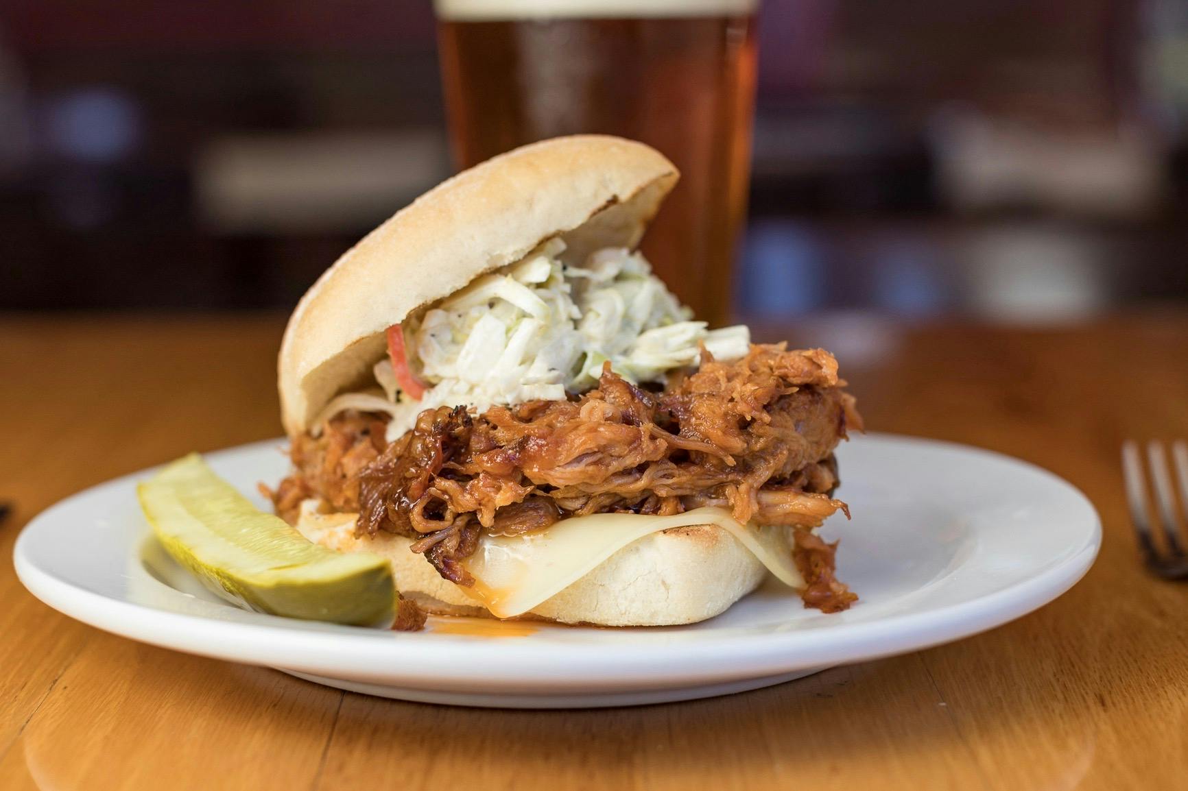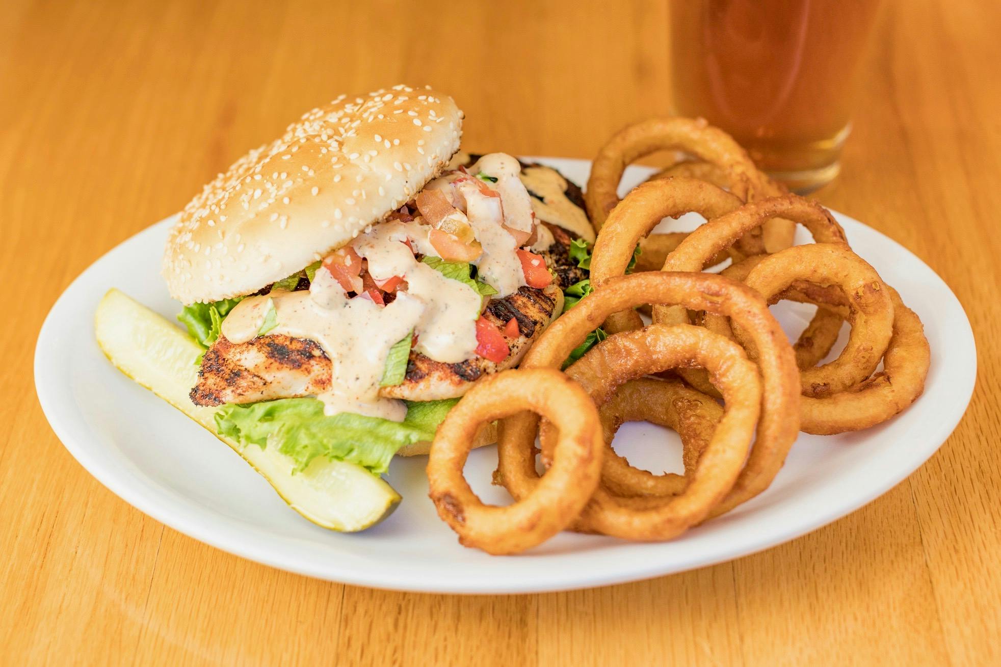 A Six Ounce, Fresh Chicken Breast Char Grilled Over an Open Flame, Served on a Fresh Kaiser Bun with a Kosher Pickle. Add a Side of Pub Fries or House Fried Chips for $2 or a Side of Onion Rings for $2.75.