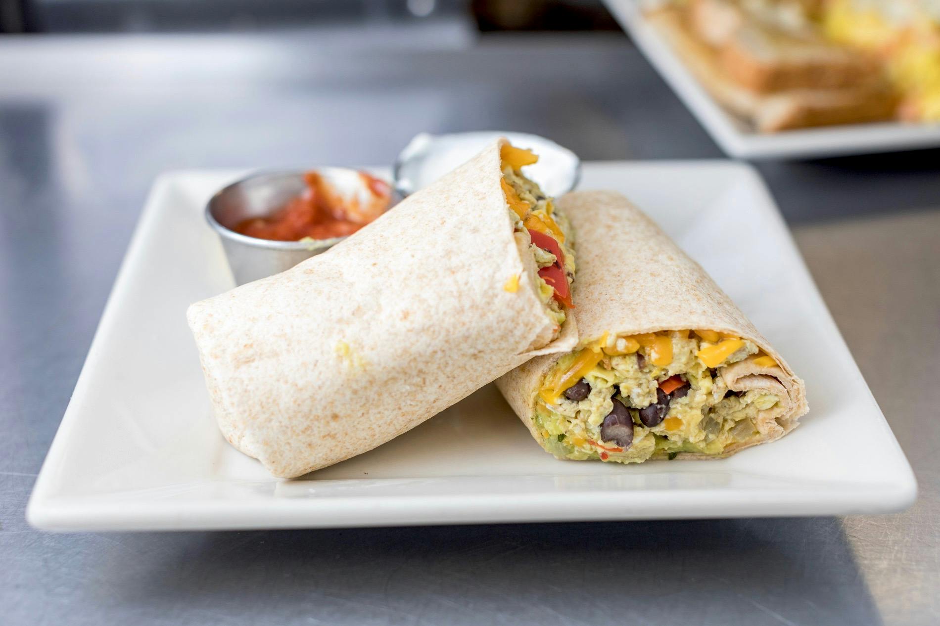 Southwest Breakfast Wrap Scrambled eggs, black beans, red onion, cheddar cheese, avocado and cilantro wrapped in a whole grain tortilla. Served with salsa and sour cream if you wish.