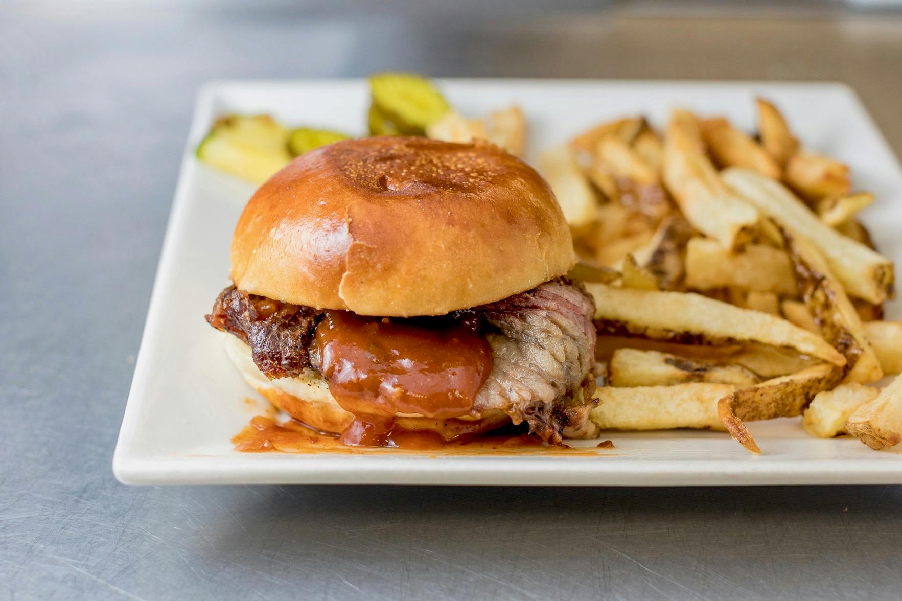 BBQ Brisket Sandwich Slow roasted brisket sliced thin, piled high and served with our French press sweet and spicy BBQ sauce on a toasted bun. Served with hand cut french fries.