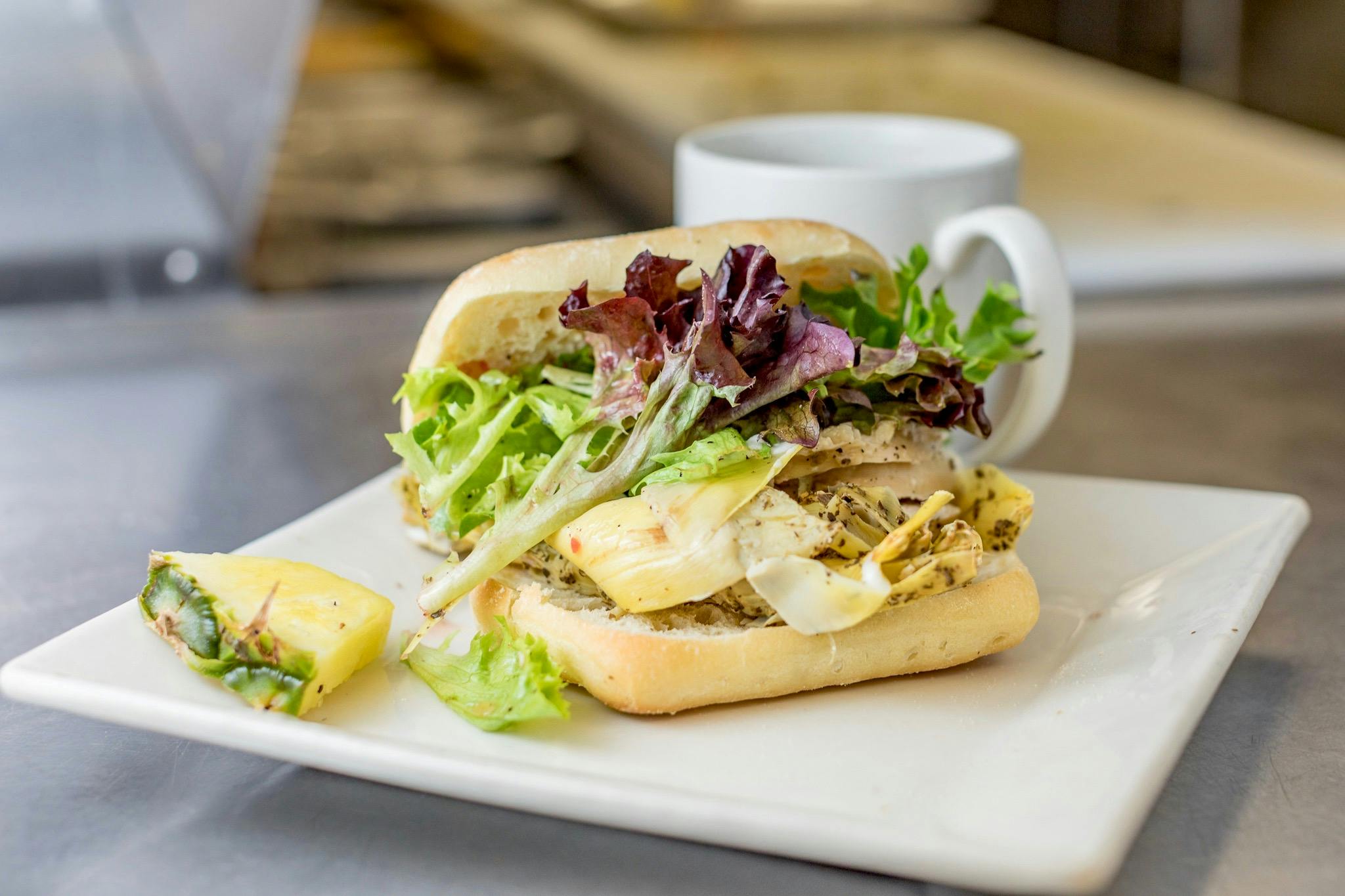 Roasted Artichoke Chicken Sandwich Roasted chicken slices, roasted artichokes, melted mozzarella and vinaigrette greens served on a toasted ciabatta roll.