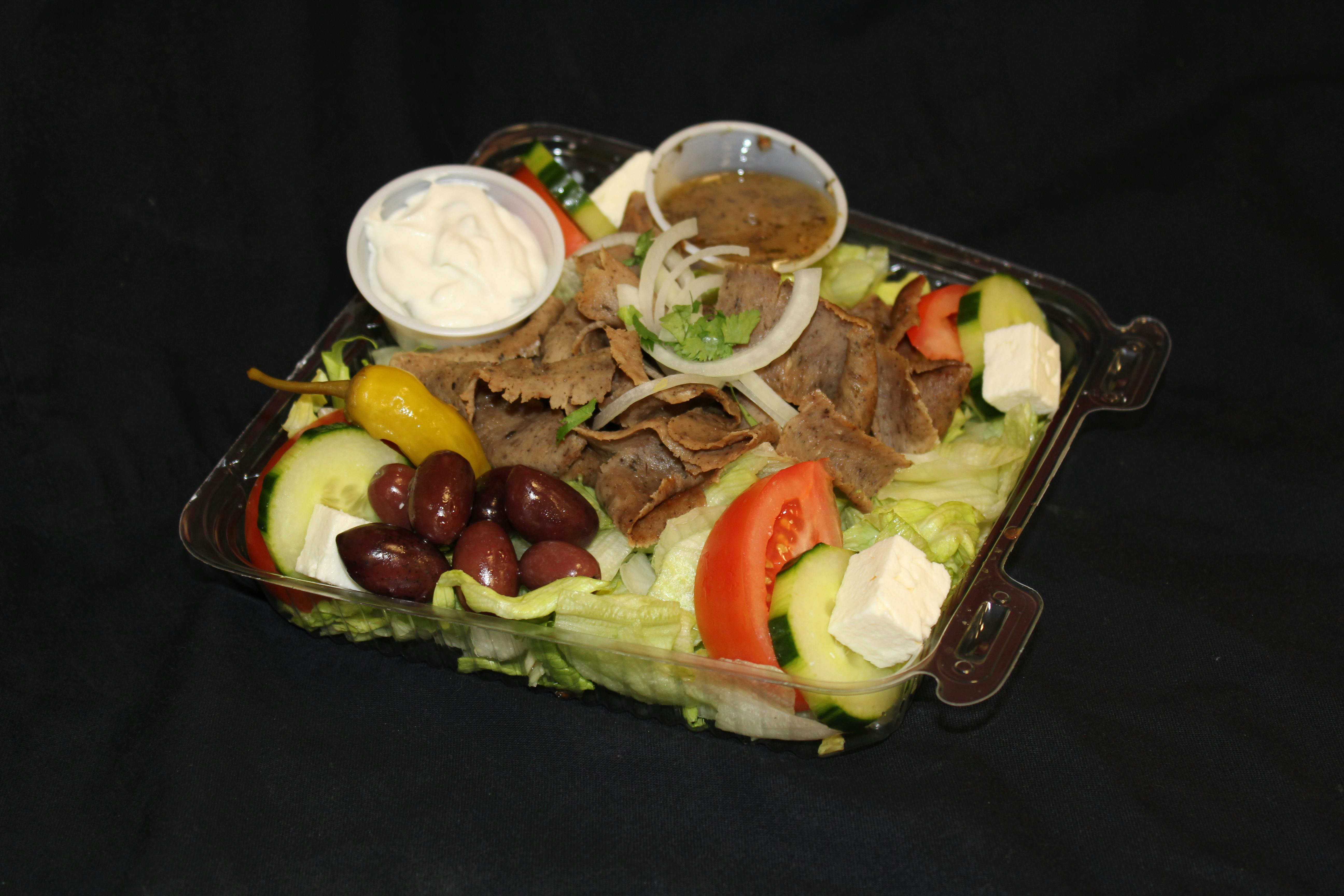 - Gyro SaladCrisp lettuce topped with fresh tomatoes, cucumbers, onions, Feta Cheese, Gyro Meat and Greek Olives. Served with a Greek Vinaigrette.$15.54
