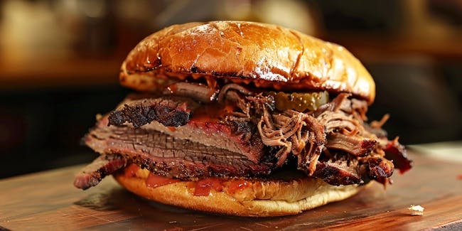 Brisket - Sandwich Delight in our Brisket Sandwich with Slaw, served on a perfectly toasted sub. Tender, slow-smoked brisket, seasoned to perfection, is layered generously on a warm, toasted sub roll. Topped with crisp, tangy slaw that adds a refreshing crunch, this sandwich offers a harmonious blend of smoky, savory, and zesty flavors. Each bite delivers a satisfying contrast between the juicy brisket and the vibrant slaw, all encased in a crunchy, golden sub. Perfect for a hearty lunch or a satisfying dinner, this brisket sandwich is a true BBQ delight.