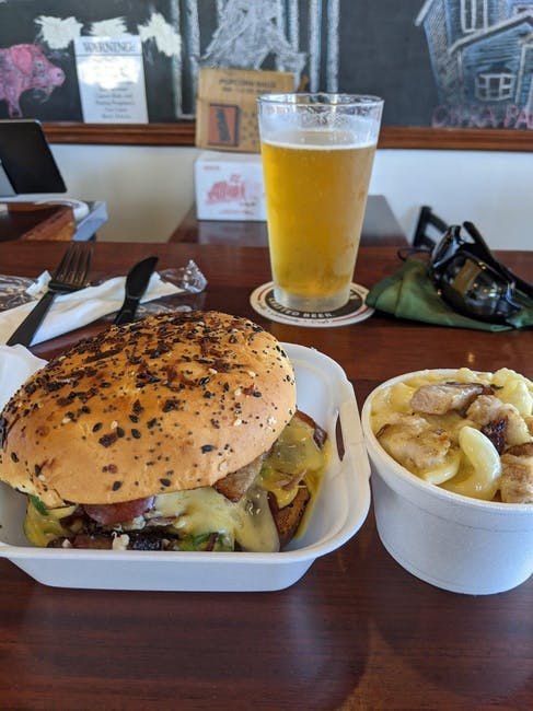 The Cheesy Porker Start with a sesame seed bun, toast it with butter. Add 3 oz of apple-infused slow-smoked pulled pork. Add just a little bit of SAUSAGE PORK ANDOUILLE. Then add our homemade smoked and maple-cured bacon. A little bbq sauce and PERFECT... and then ADD CHEESE