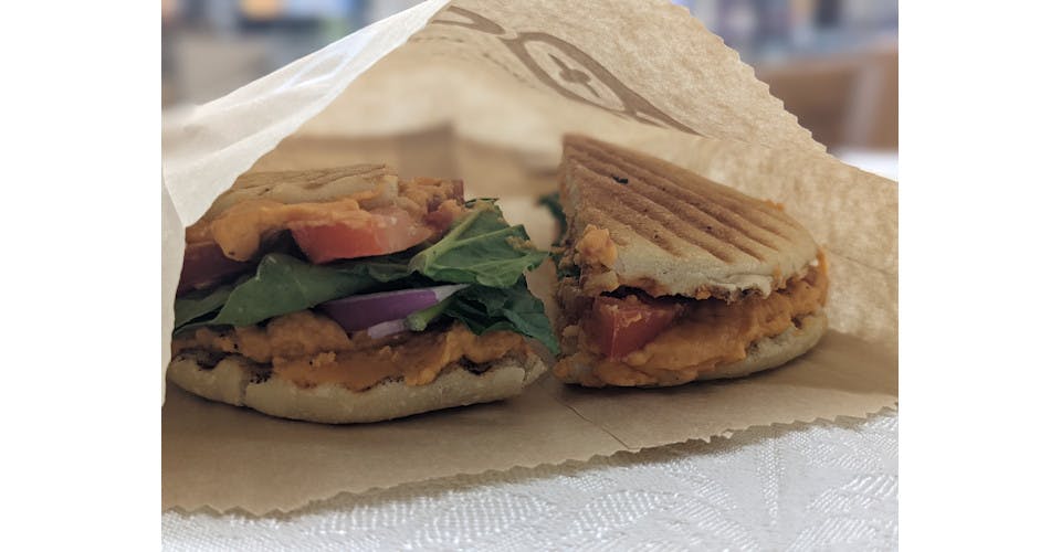 Toasty Hummus Panini (Vegan) Hummus, spinach, cucumber, tomato, and red onion.