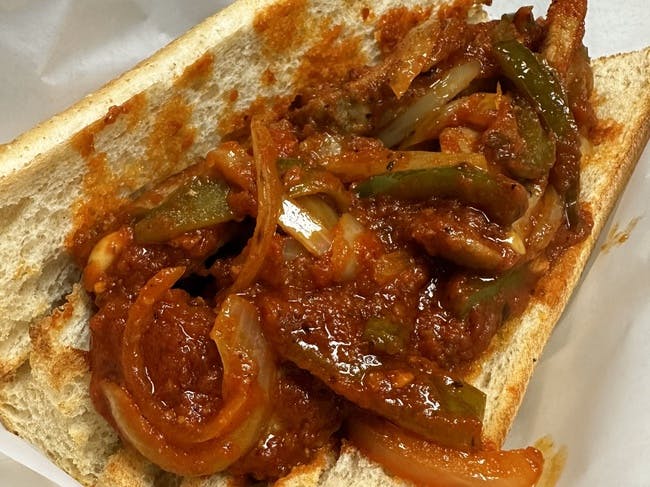 - Faux Sausage, Peppers, and Onions SandwichSavory vegan Sausage grilled with sweet bell peppers and caramelized onions, served hot on a toasted baguette.$21.85