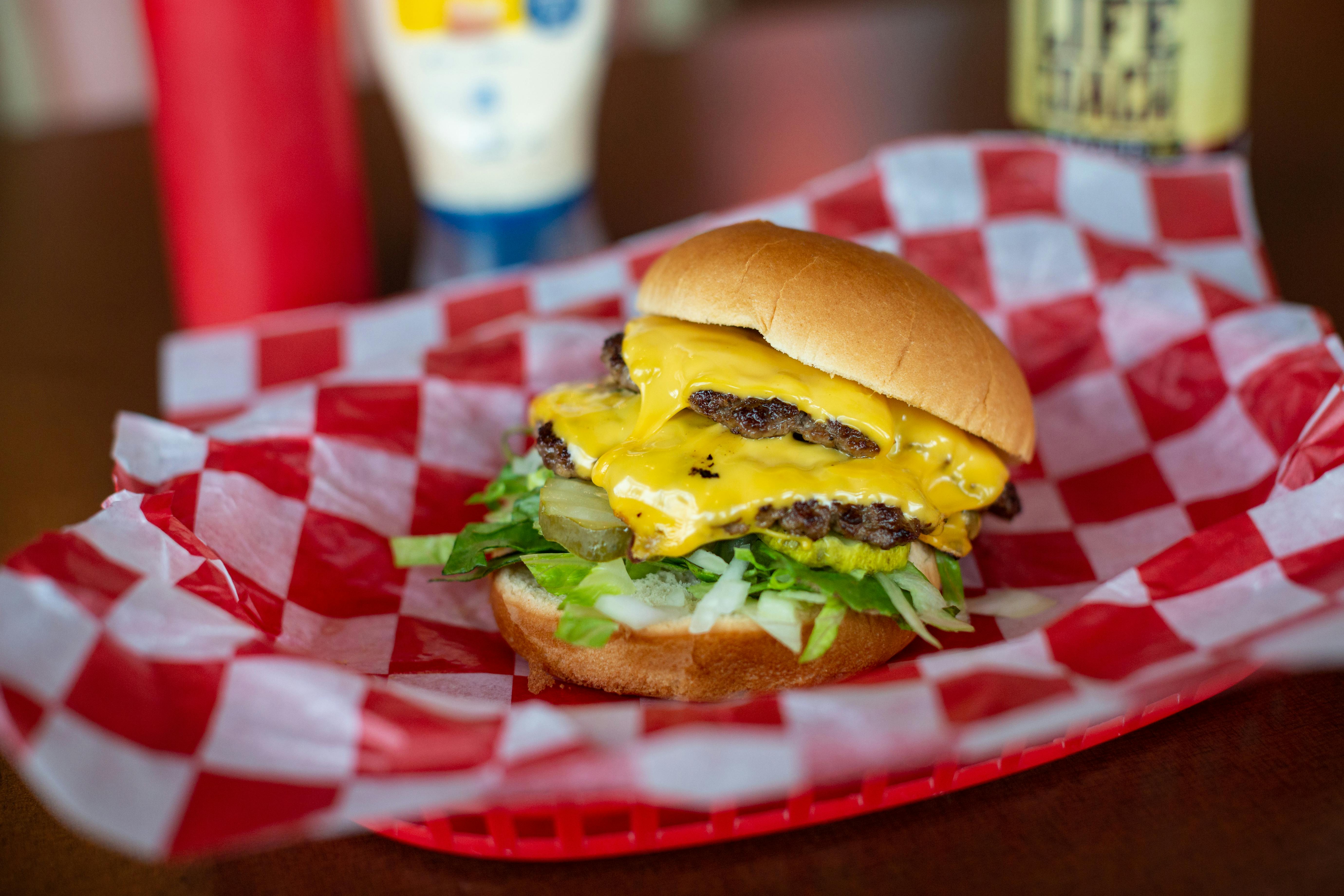 The Jay Hog Burger 50/50 grind of bacon and beef. Topped with American cheese, grilled onions, bacon, and special sauce.