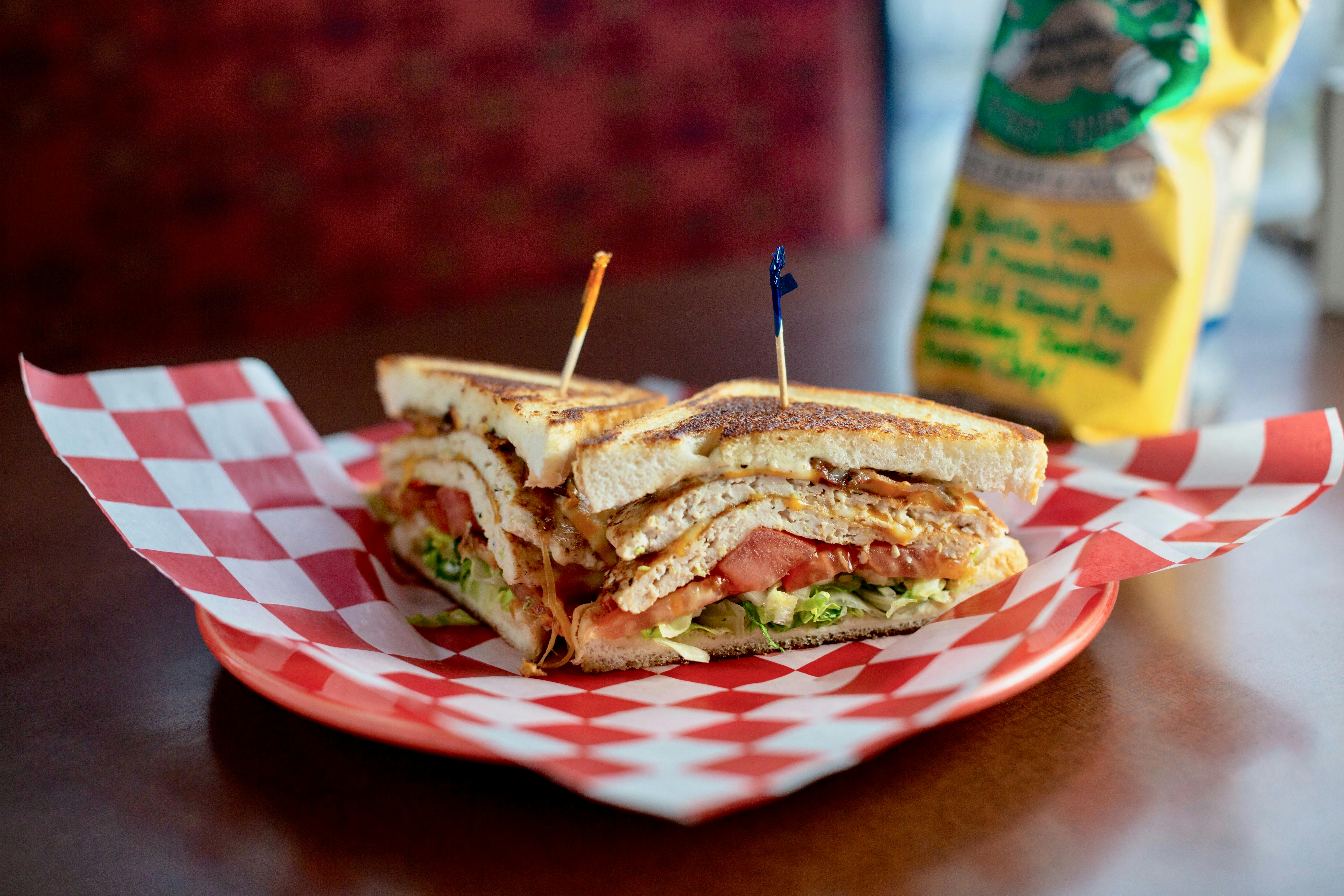 Grilled Chicken Club With lettuce, onions, tomato, bacon, cojack cheese, and garlic mayo on Texas toast.