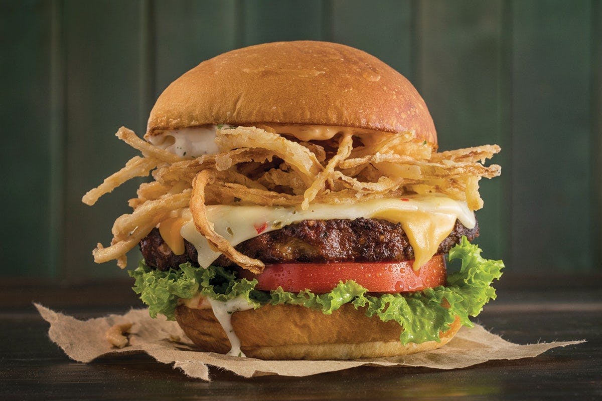 The Meatless Beast Black Bean Vegan, Cheddar Cheese, Pepper Jack Cheese, Fried Onion Strings, Lettuce, Tomato, Ranch, MOOYAH Sauce, Signature Potato Bun