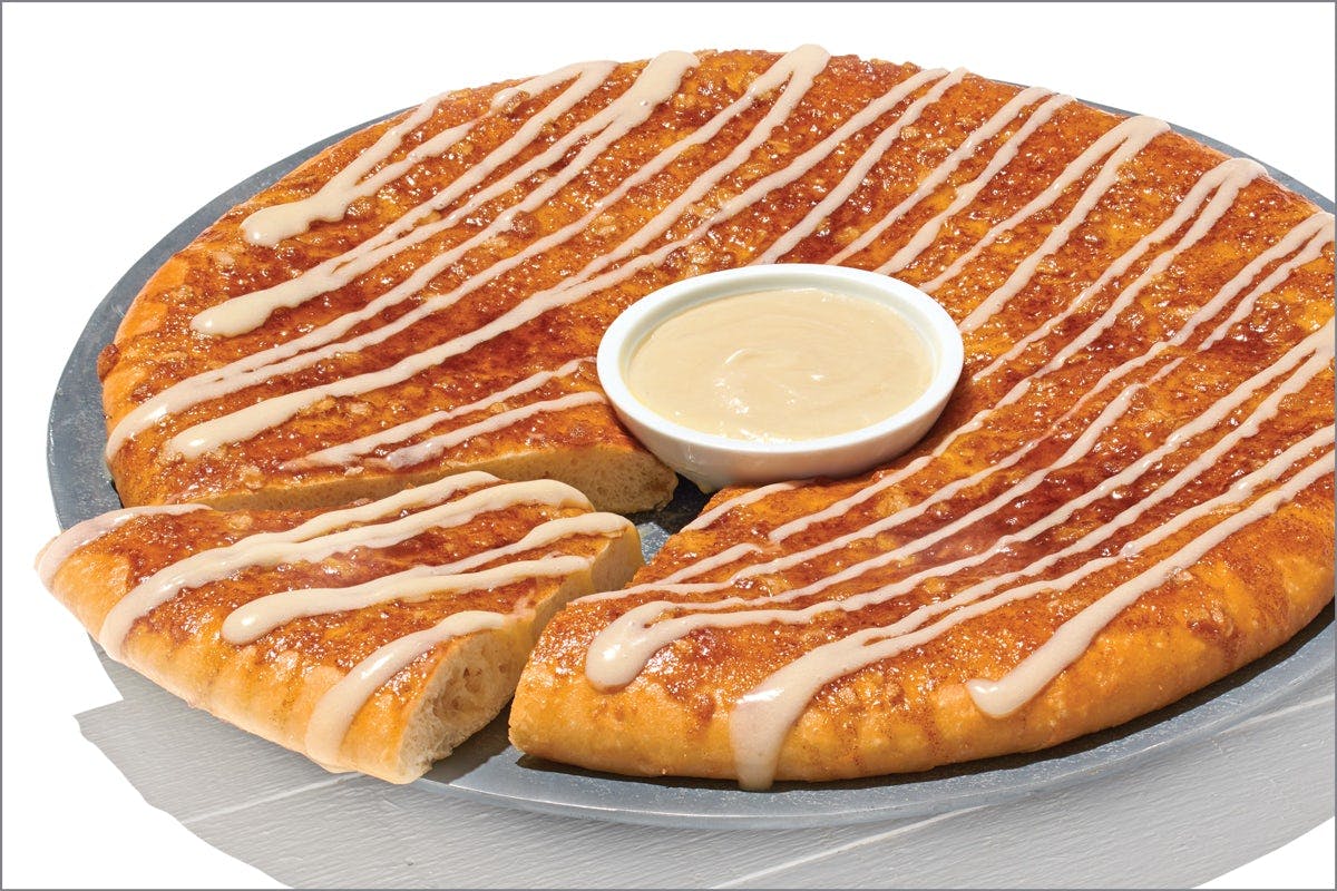 Cinnamon Wheel - Baking Required Original Crust topped with Cinnamon Spread, Oatmeal Crisp Topping, and served with Cream Cheese Frosting