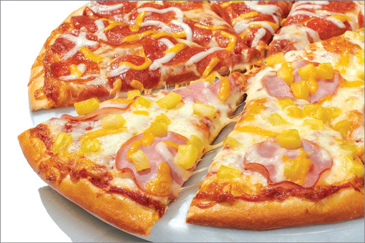 Half Pepperoni/Half Canadian Bacon and Pineapple, Whole-Milk Mozzarella, Cheddar, and Traditional Red Sauce