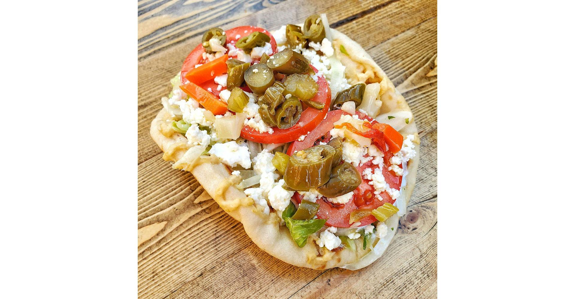 Hummus, lettuce, tzatziki, onions, tomatoes on a pita with feta, spicy giardiniera peppers.(GF if ordered without pita)