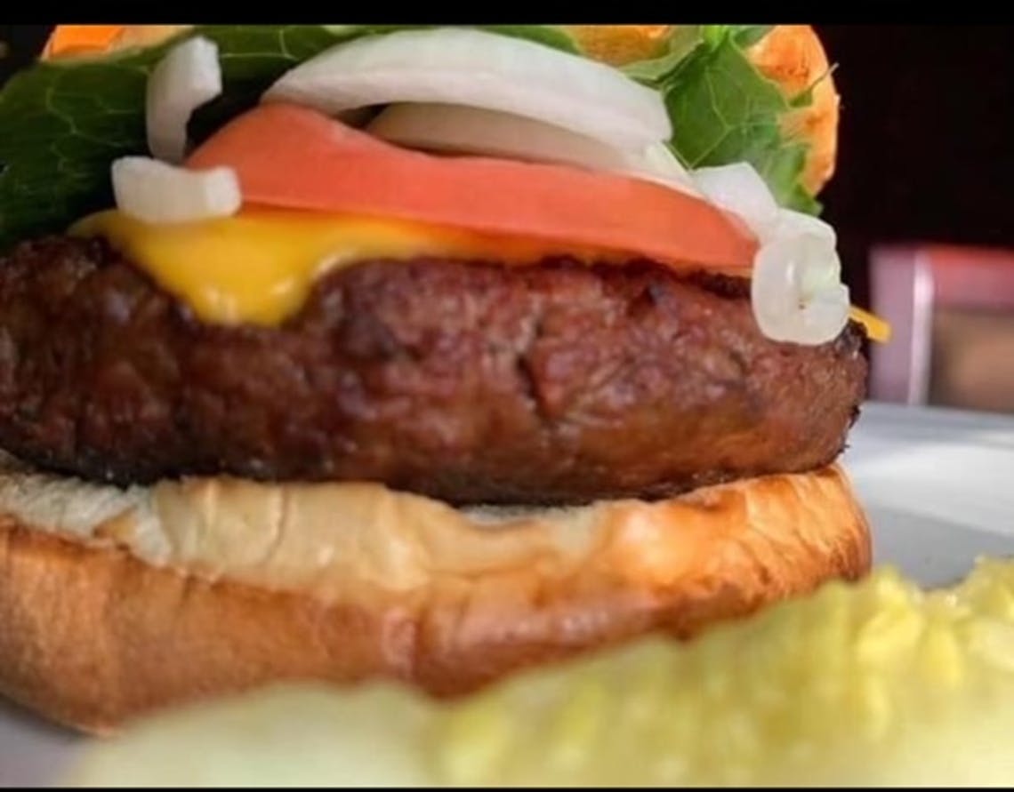 Impossible Burger Topped with red cabbage lettuce tomatoes onions spicy tahini and American cheese. Served on a brioche bun.