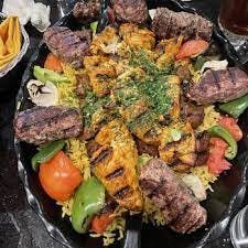 Sultan Platter 12 Skewers of Meat Served above a bed of Rice and Vegetables.