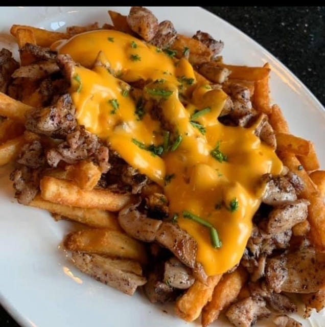 Shawarma Cheesy Fries French Fries Topped with Melted Cheese, Jalapenos, Sour Cream, and Your Choice of Beef or Chicken Shawarma.