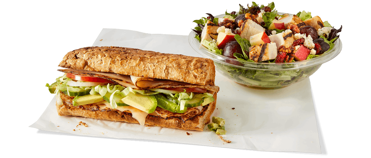 Avo Turkey Hand-sliced turkey breast, swiss, fresh-sliced avocado, cucumbers. Want to spice it up a little? Try it with our NEW Hot Pepper Ranch.