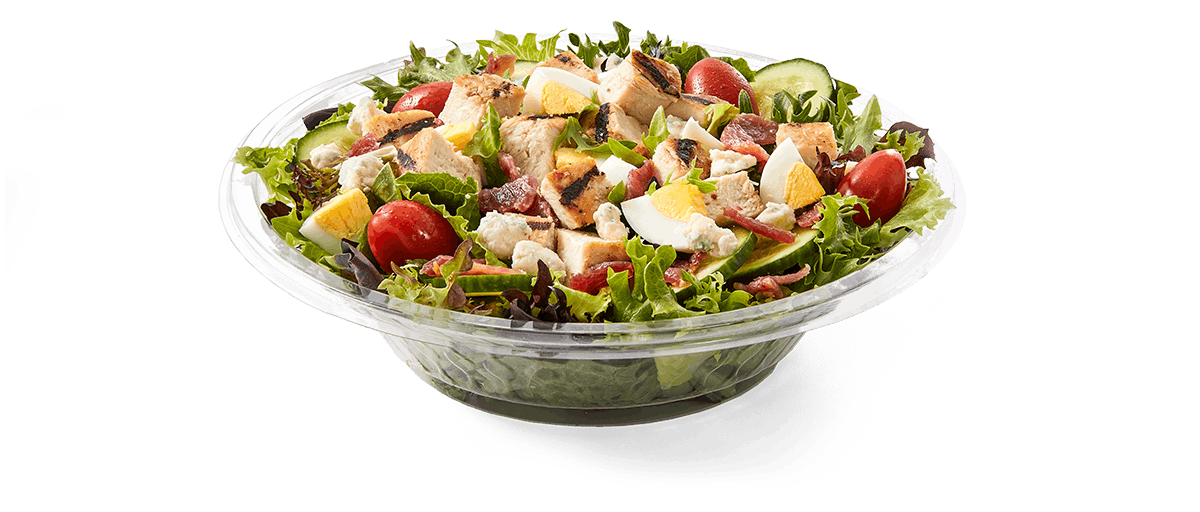 Farmhouse Salad All-natural grilled chicken breast, bacon, crumbled blue cheese, hard-boiled egg, cucumber and tomatoes, served on a bed of field greens with creamy buttermilk ranch. Want to spice it up a little? Try it with our NEW Hot Pepper Ranch.