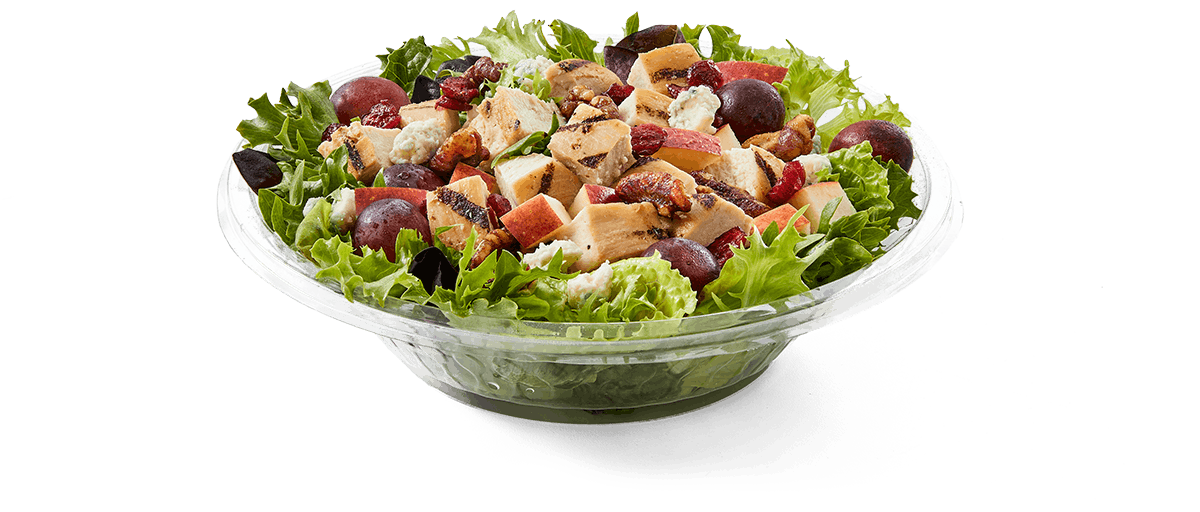 Apple Walnut Salad All-natural grilled chicken breast, crumbled blue cheese, grapes, apples, dried cranberries, candied walnuts, served on a bed of field greens, with balsamic vinaigrette