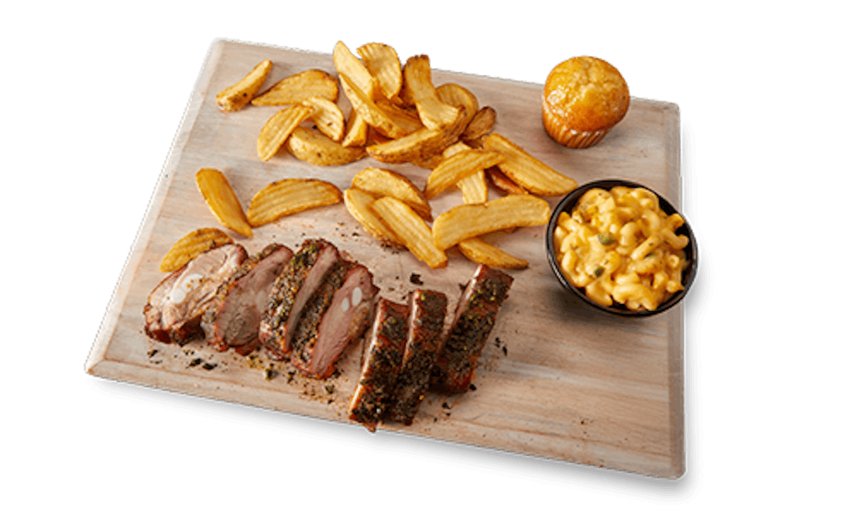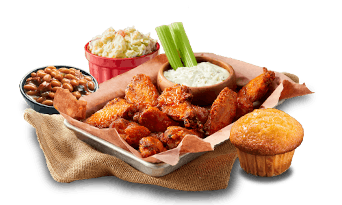 Feast for 2 Generous helpings of Ribs, Country-Roasted Chicken, choice of Texas Beef Brisket or Georgia Chopped Pork, Creamy Coleslaw, Famous Fries, Wilbur Beans, Sweet Corn and Corn Bread Muffins. Served family-style for 2-3 people.